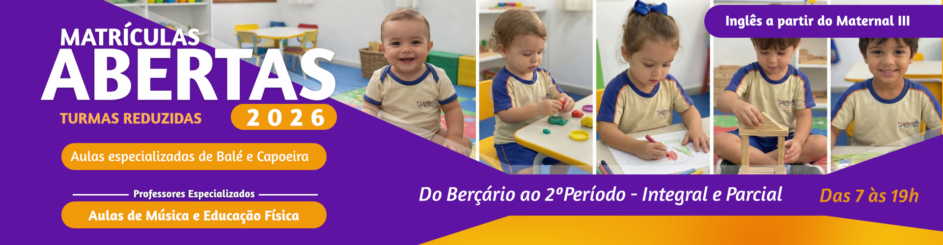 Nossas turmas são reduzidas e temos uma estrutura adequada para o desenvolvimento social, cognitivo e motor de nossos alunos, além de contar com profissionais capacitados que proporcionam um ambiente estimulador para a construção de novos conhecimentos
